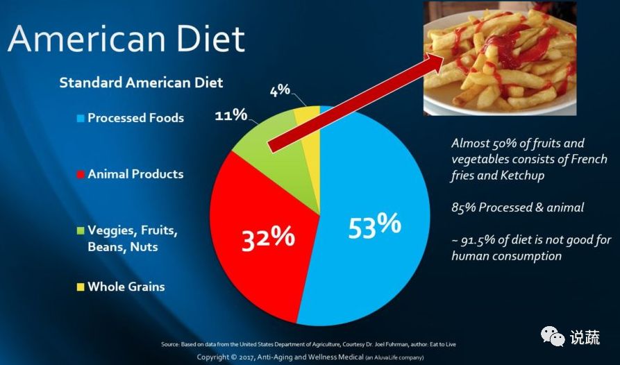 令人遗憾的是,多数美国人的饮食质量指数不超过10分。美国标准饮食(Standard American Diet)的饮食质量指数评分是11分(百分制)。据美国农业部的估算,美国人32%的热量来源于动物性食物,57%来源于加工性植物性食物,仅有11%来源于全谷物、豆类、水 果、蔬菜和坚果。如果用0~10打分,美国人大概得1分。