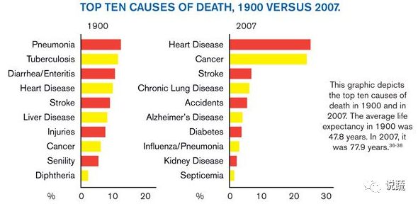 那又怎样?现在已是21世纪了,我们难道不能想吃什么就吃什么,得病 了再吃药吗?这应该是病人、甚至某些医生的普遍心态。每年全球的处方药 花费总额已突破1万亿美元,美国占据该市场份额的1/3。我们为什么会在药物 上耗费巨资?许多人认为死亡早由基因决定。55岁前得高血压,60岁得心脏 病,70岁得癌症……但对威胁生命的主要疾病来说,基因发挥作用的比例仅占 其10%~20%,如本书中的案例,像心脏病、癌症等主要杀手的患病率,在全 球不同国家与地区间的差异可达百倍。当人从患病率低的国家移居到患病率高 的国家,他自身的患病率会变动到与新环境相匹配。新饮食意味着新疾病。因 此,一个住在旧金山的60岁的美国老人,他5年内得心脏病的概率是5%。如果 他搬到日本,遵从日本的饮食和生活方式,那么上述概率会降到1%。40多岁的 日裔美国人和60多岁的日本人患心脏病的概率是相当的。事实上,美国式的生 活方式让他加速老化了20年。