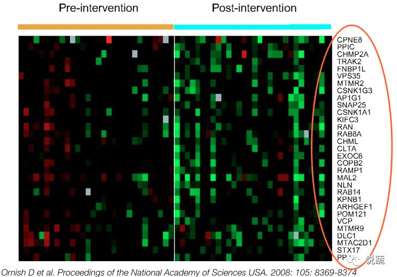 如果我们多吃植物性食物会如何?在《营养与生活方式调节基因表达》研究中,欧宁胥医生和同事给前列腺癌病人做了两次活检,一次是3个月前,一 次是经历了3个月饮食改变(全蔬食)后。病人没有接受化疗或放疗, 体内竟有500种不同的基因转为正向表达。仅仅数月,防癌基因活性增强,乳腺 癌、前列腺癌致癌基因被抑制。