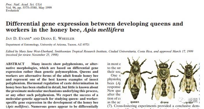 这影响有多大呢?我举个例子:想想不起眼的蜜蜂,蜂后与工蜂基因相 同,蜂后一天可产2000个卵,而工蜂是不孕的,蜂后能活3年,而工蜂仅能活3周。两者的差异是由于饮食的不同造成的。蜂后垂死之际,保育蜂会挑选出一 只幼虫,喂它一种叫蜂王浆的分泌物,幼虫服用后,曾压制“皇家”基因的酶 被关闭,自己也就成为新的蜂后。蜂后与工蜂有着一模一样的基因,然而就是 因为吃了蜂王浆,它的生活与寿命发生了翻天覆地的变化。