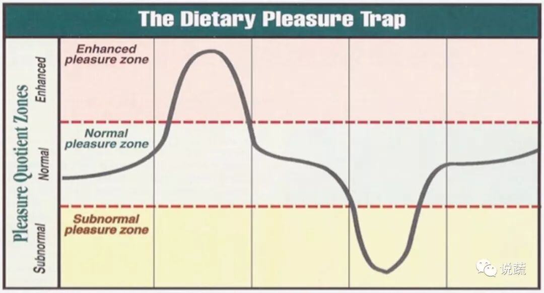 下图就是饮食快乐陷阱图。与上图类似,分为5个阶段。普通饮食,垃圾食品,习惯形成,改变饮食习惯,成功转向全蔬食。