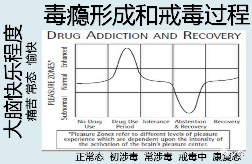在这张图中,横坐标是时间,代表“瘾”或习惯的行成和摆脱的过程。纵坐标是大脑快乐中心的活跃程度,如多巴胺的分泌程度,从下往上分为三个区域,痛苦,正常和愉快,或兴奋程度高,中和低。初涉毒会异常兴奋,习惯后处于常态快乐。戒毒中就会痛苦,戒毒成功也会处于常态快乐。