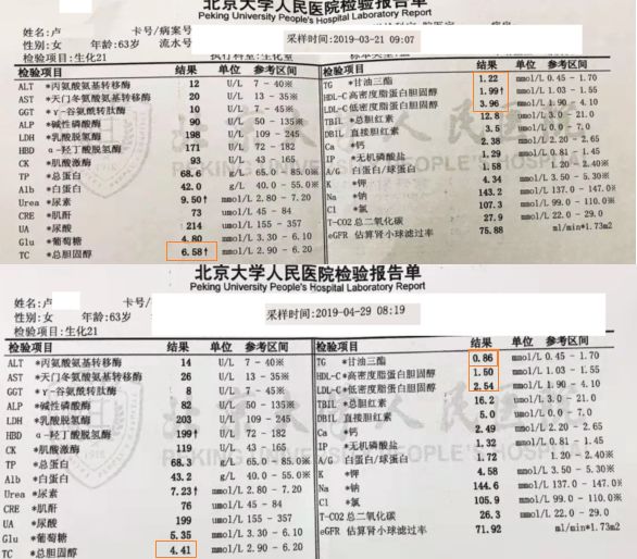 z女士体重从48.3降到47.5公斤,下降0.8公斤。总胆固醇从5.7降到3.96,下降1.74;低密度密度脂蛋白LDL从2.72 降到2.56, 下降0.16。