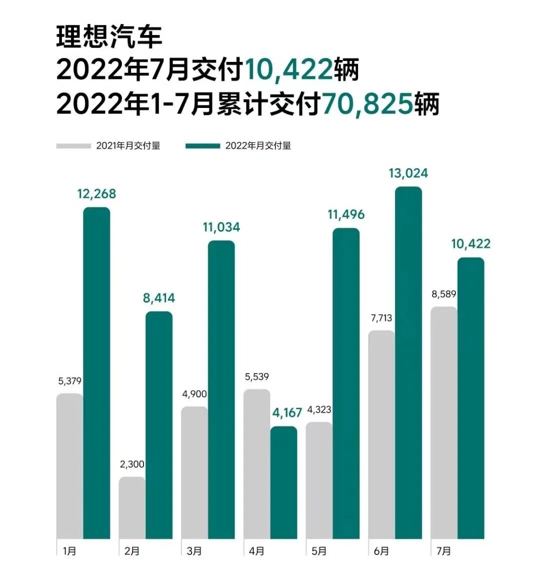 理想汽车在月度交付量上与小鹏相差不大,7月,理想共10,422辆理想ONE,同比增长21.3%。今年1-7月,理想ONE已累计交付70,825辆。