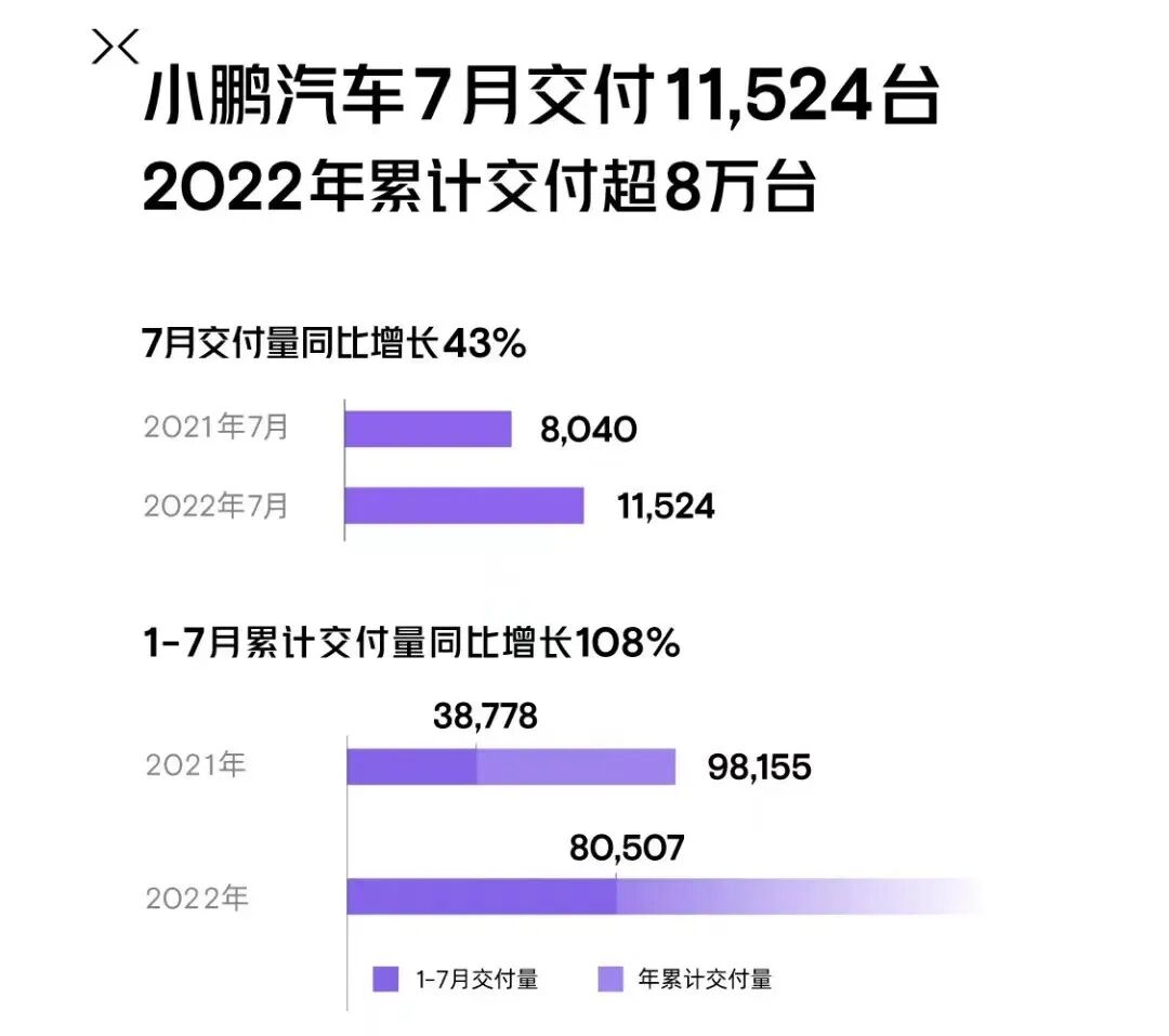 7月新势力交付排位第三的是小鹏,其当月共交付11,524辆车,同比增长43%。其中,小鹏P7交付6,397辆,P5交付3,608辆,G3i交付1,519辆。