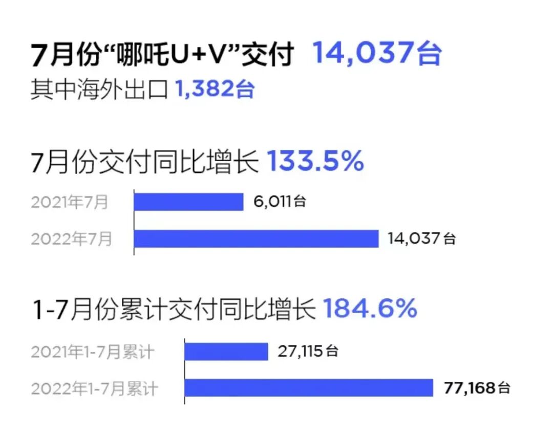 7月哪吒共交付14037辆车,同比增长133.5%,位居新势力7月交付之首。凭借哪吒V和哪吒U两款车,今年七个月以来,哪吒已经5次实现月交付破万,1-7月,哪吒累计交付量已达77168辆,同比增长184.6%。