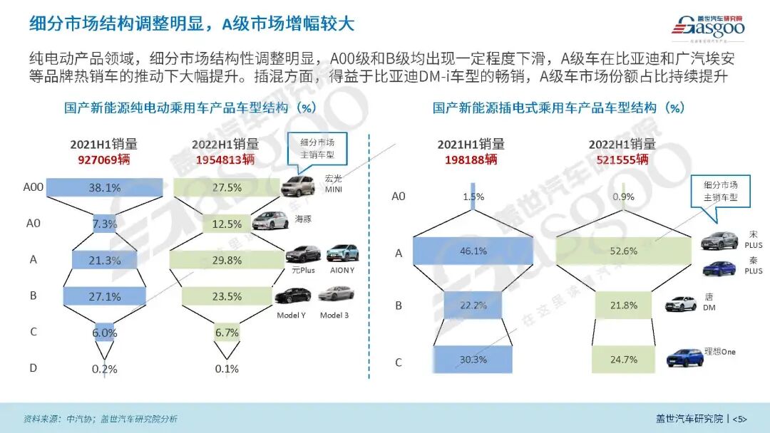 总体上来看,我国新能源汽车已进入市场为主+政策为辅驱动阶段,2022年H1我国新能源乘用车销量达到247.6万辆,渗透率超过了24%。具体来看:①2022年H1我国PHEV的同比增速超过了BEV,达到了163.2%,且传统自主和自主新势力的增量更加明显;②得益于比亚迪、广汽埃安新能源车型热销,我国新能源汽车市场A级车市场占比大幅提升,市场结构加速向纺锤体发展。