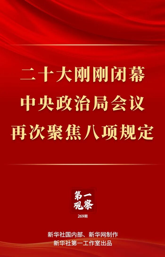 10月25日,党的二十大闭幕刚三天,习近平总书记主持召开中央政治局会议,研究部署学习宣传贯彻党的二十大精神。会议上,审议了《中共中央政治局贯彻落实中央八项规定实施细则》。