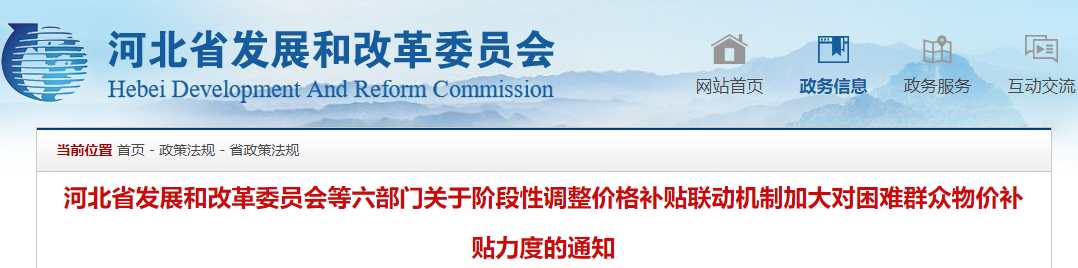 各市在认真执行《河北省发展和改革委员会等六部门印发〈关于进一步健全社会救助和保障标准与物价上涨挂钩联动机制的实施意见〉的通知》(冀发改价调〔2021〕1710号)规定基础上,将领取失业补助金人员和低保边缘人口等两类群体,阶段性新增纳入价格补贴联动机制保障范围。执行期限为2022年9月至2023年3月(对应2022年8月至2023年2月物价指数)。