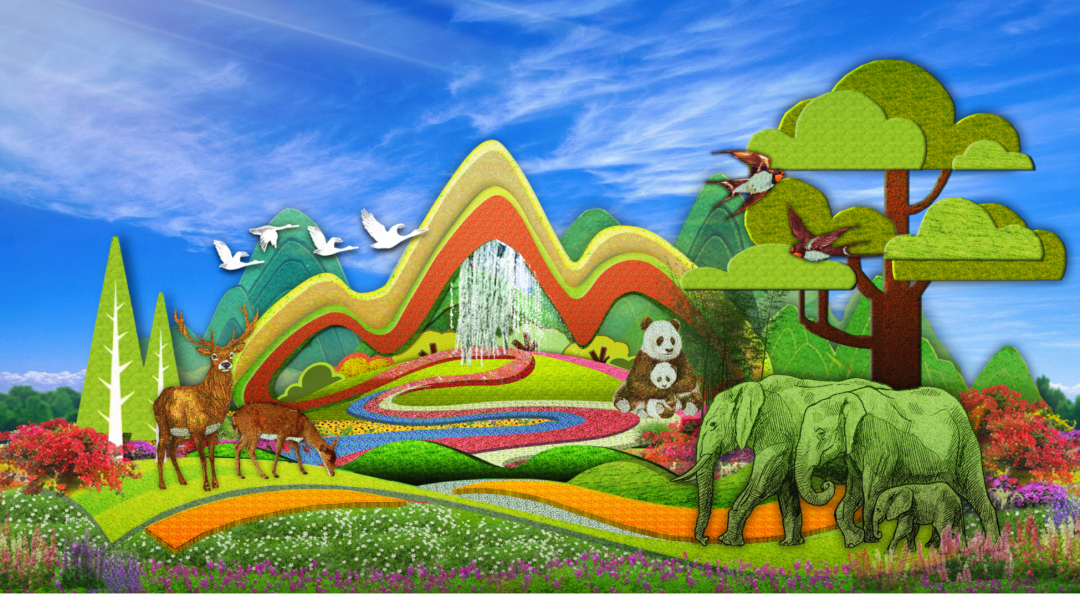 - 长安大厦布置“绿色发展”花坛,花坛顶高8.5米,体现了生态优先、绿色发展的美好景象,寓意绿水青山就是金山银山。