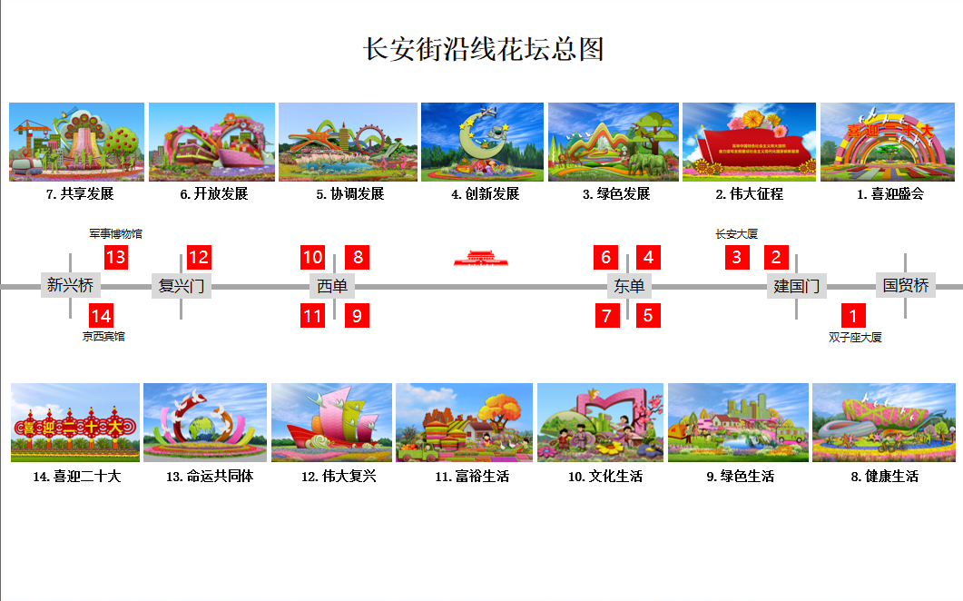 东长安街7处花坛以新发展理念为主线,展示党的十八大以来伟大祖国取得的辉煌成就。西长安街7处花坛以人民为中心共创美好生活为主线,描绘人民幸福生活新篇章及展望美好未来。- 双子座大厦布置“喜迎(庆)盛会”花坛,花坛顶高7.5米,以彩虹门为主景,镶嵌有“喜迎二十大”组字,烘托喜迎盛会的喜庆氛围。
