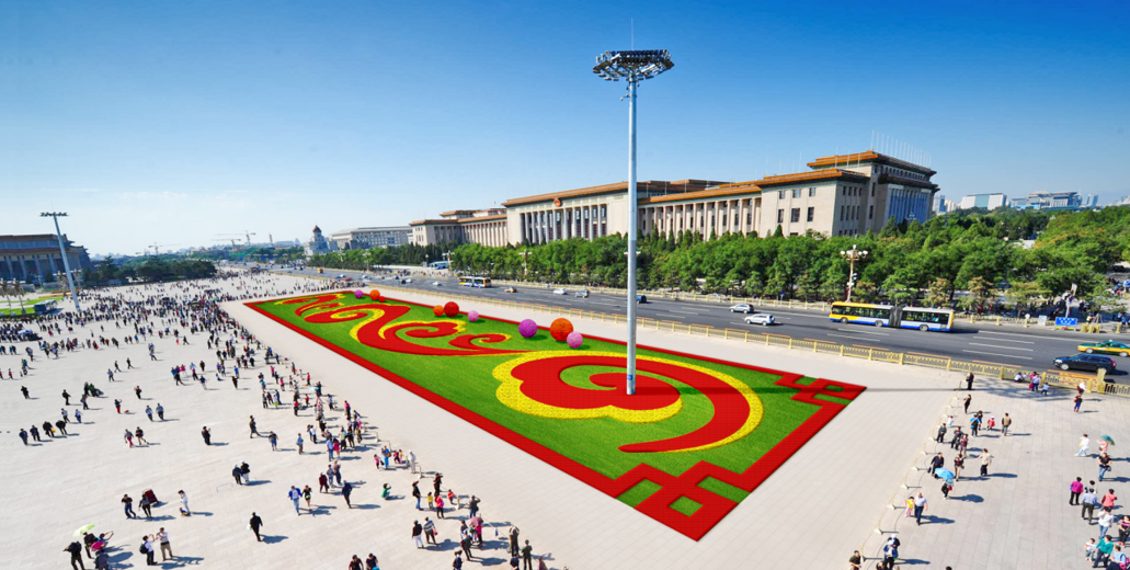 - 东单东北角布置“创新发展”花坛,花坛顶高9.5米,寓意全面贯彻新发展理念,深入实施创新驱动发展战略,加快建设科技强国,实现高水平科技自立自强。