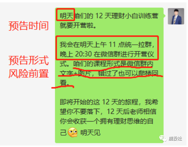 目的是预告明天的毕业晚会,同时增加信任感,让大家觉得我的负责人设是一以贯之的,不会因为推课前后而改变。同时让大家准备感悟,方便第二天群氛围引导。