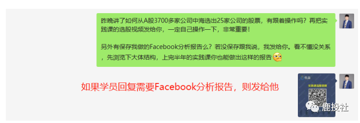 课件部分未做大改动(除了增加图片),后面也是带着大家选股。但后面有发Facebook 的企业分析报告,增强价值感,同时群发有调整。如下图所示(Facebook分析报告见附件)