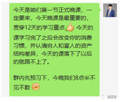 1)白天:通过群发让大家都把自己的学习感悟发到群里。如果真实学员实在少,可以上小号。但一般如果你前面人设立住了,信任感和价值感都在,会有很多真实学员互动。