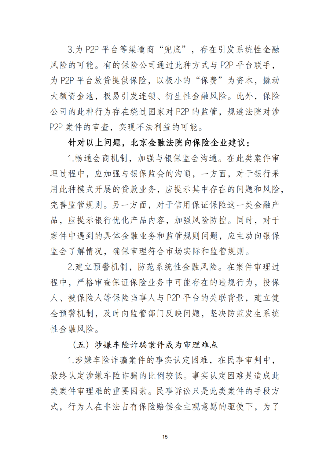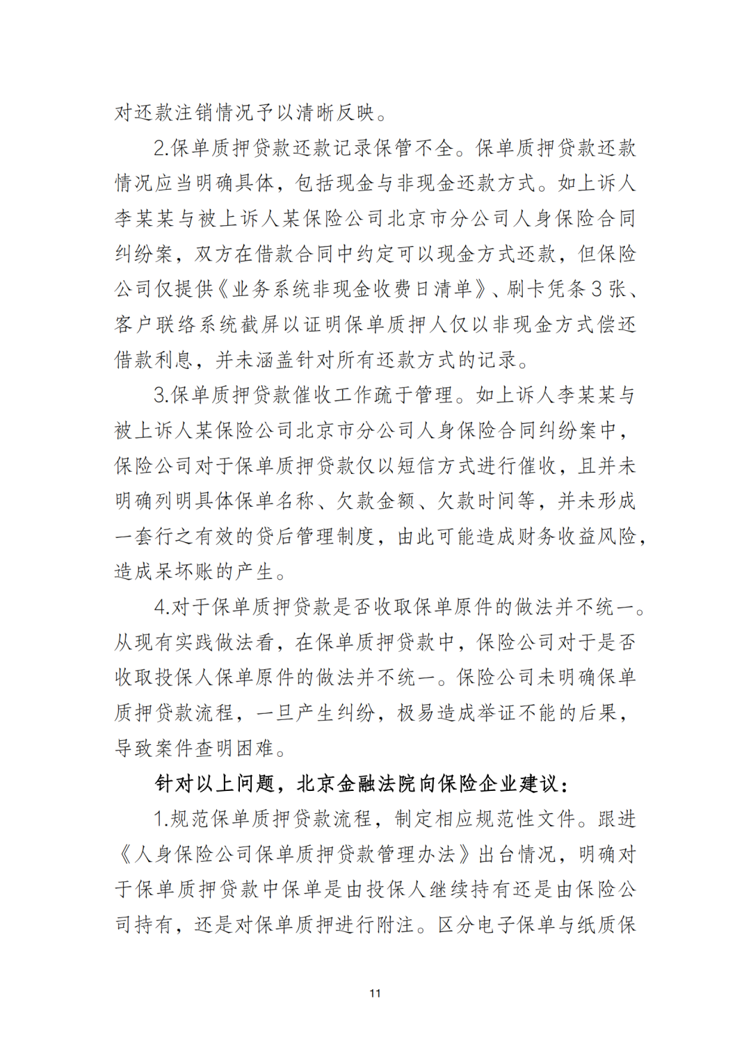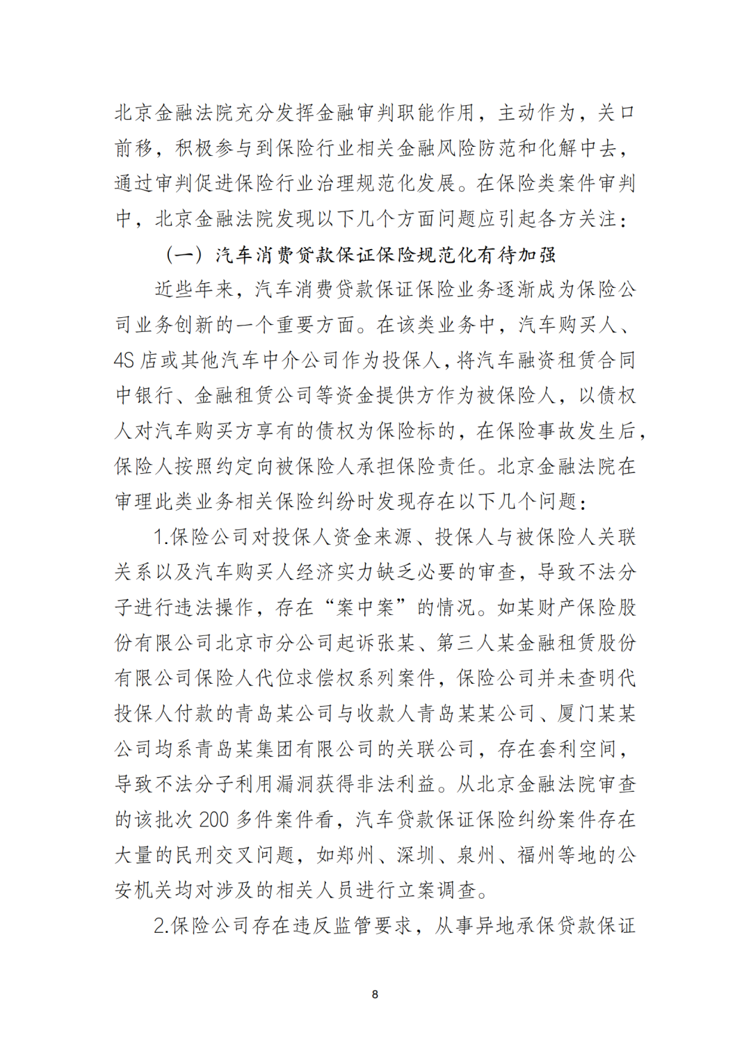 《北京金融法院保险类纠纷审判白皮书》指出,目前保险行业治理及保险企业经营中存在的问题主要集中在汽车消费贷款保证保险、保单质押贷款业务规范化等方面。再保险纠纷中,部分保险公司混淆再保险与共同保险,以“共同保险”之名行“再保险”之实等问题也应当引起重视。同时,保证保险中“高利放贷”现象和涉嫌车险诈骗案件成为了目前保险类案件审理中的难点问题。