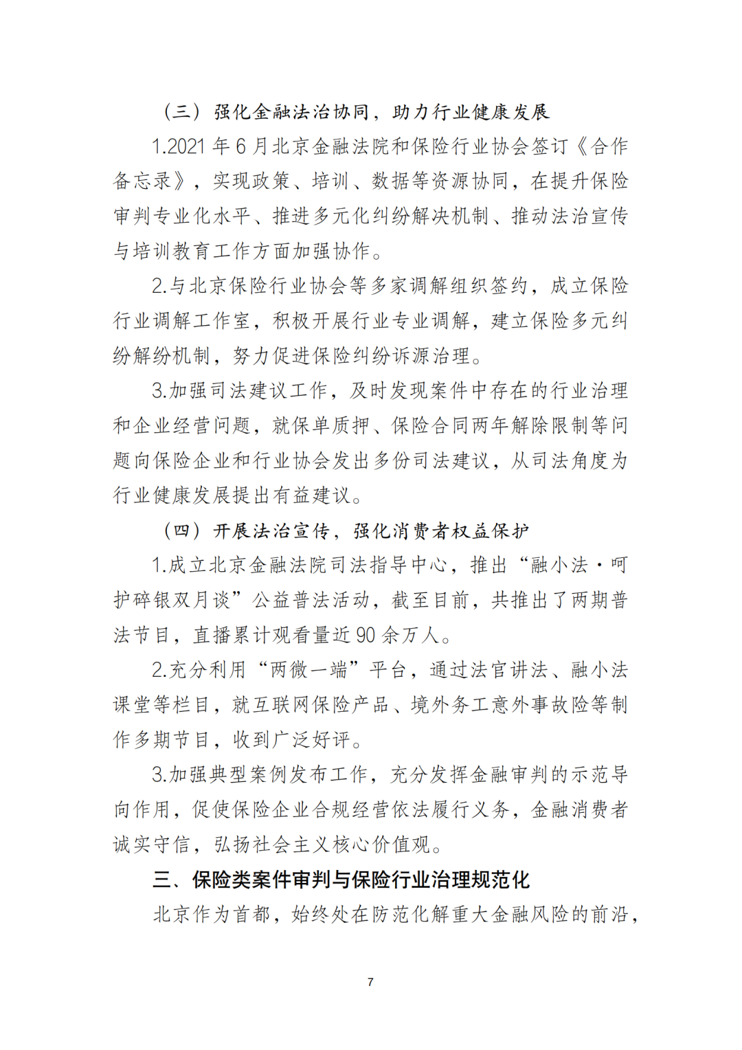 据了解,为促进保险纠纷诉源治理,北京金融法院与中国保险行业协会签订《合作备忘录》,开展政策、培训、数据等资源协同,与北京保险行业协会等多家调解组织签约,成立保险行业调解工作室等,在提升保险审判专业化水平的同时,推进多元化纠纷解决机制建设,助推保险纠纷诉源治理。同时,北京金融法院强化司法建议工作,就保单质押、保险合同两年解除限制等问题向保险企业和行业协会发出多份司法建议,从司法的角度为行业健康发展提出有益建议。