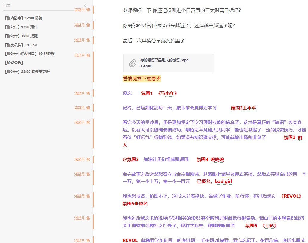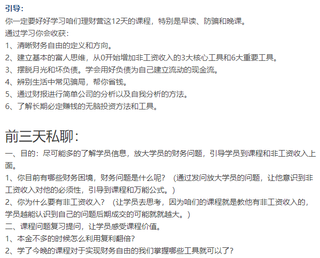 【财商教育机构小白营水军剧本】财商教育九天SOP水军剧本曝光——气氛组话术工作手册!