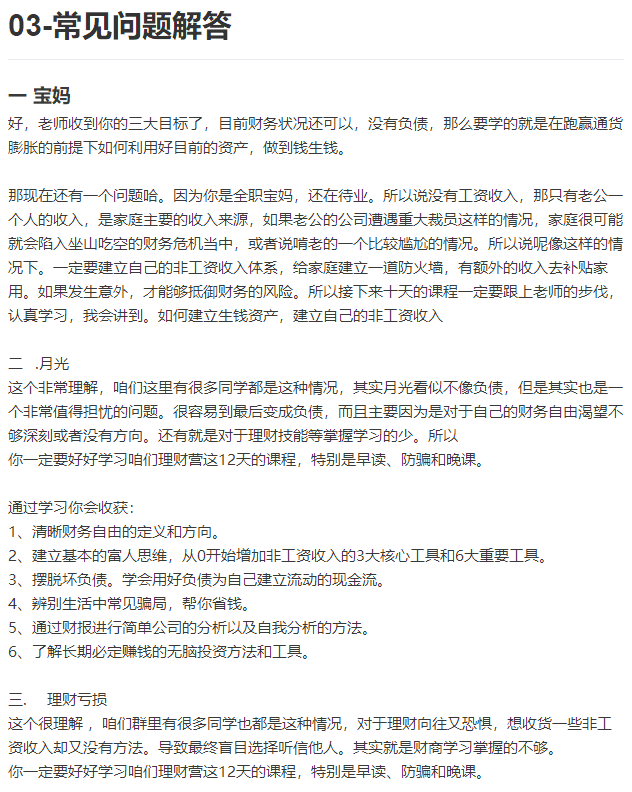 | 16 | 能不能说点具体怎么操作的?不用天天说没有用的,能不能教点实际的?课程没有干货 | 思考用户觉得没干货想直接学干货急于求成,很多人就是关注大v或者➕什么群看推荐,其实什么都不懂,不知道背后的逻辑,赚的钱都是运气,亏钱的概率要大很多,所以其实底层思维培养以及理财技能学习是非常重要的,不懂不要投。这点一定注意 | :这12天的课程价值绝对不是随便看看的同学就能够体会到的,从开营到现在,老师介绍了三大资产,介绍了股票、基金、REITS等各种工具。你扪心自问一下,这些知识你在参加咱们课程学习之前都清楚吗?咱们是小白训练营,短短这些天我讲这么多已经是尽力了。这12天我更多的是给大家指路,建立正确的理财观。况且咱们商学院有义务为想要深入学习理财技能的同学提供实操学习的方法。报名与否都是自愿的,老师绝不会强迫任何一位同学,就算不参加后续课程的学习,只要认真把这12天的课程学好也一定会有很大收获。但是随便看看的这种学习态度肯定是不行的。 | |||
