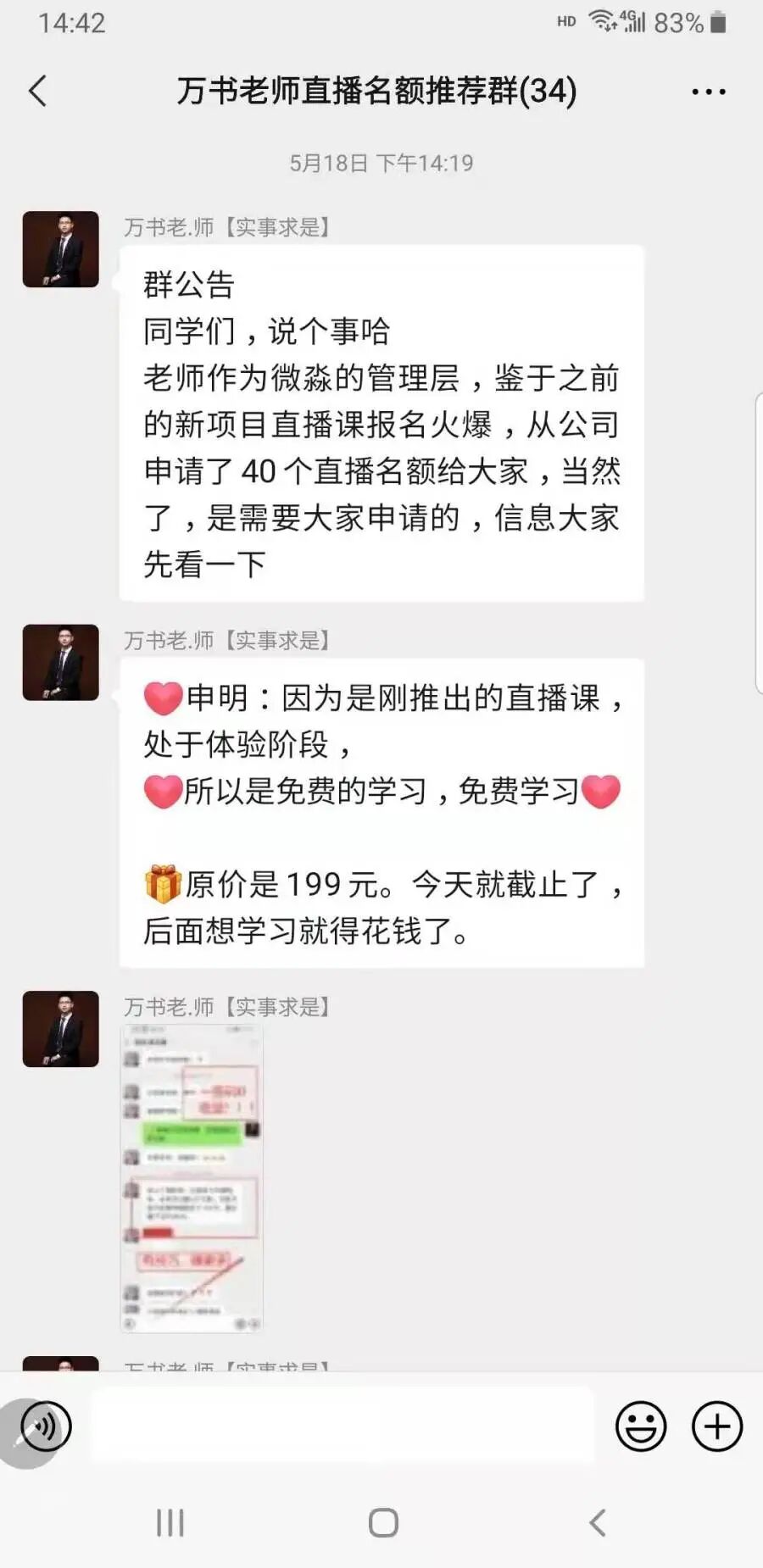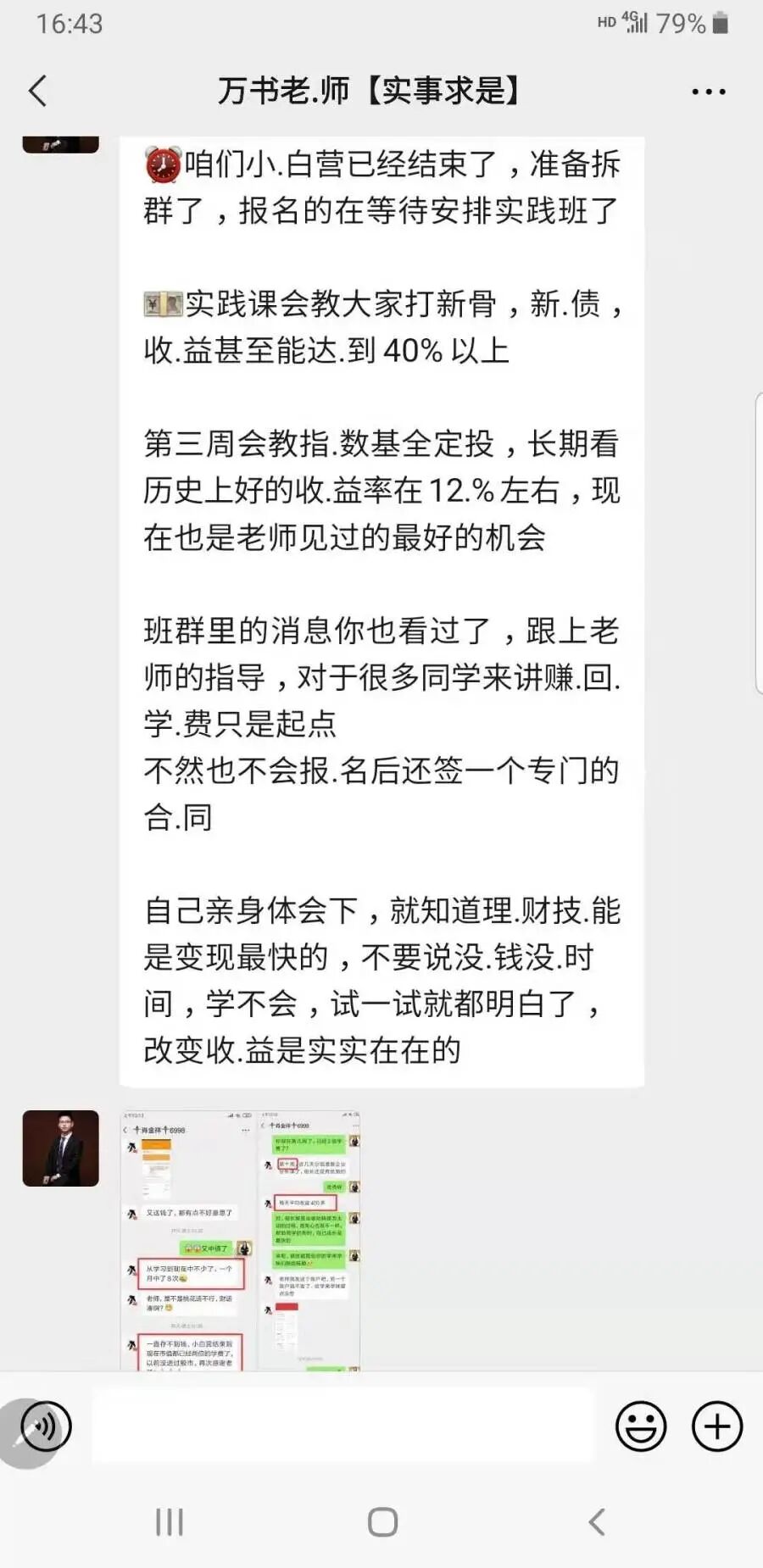 记者没有选择进阶课程,万老师又将记者拉入了一个“直播推荐群”,在群里又晒出了一系列收益截图,并作为一份福利,邀请记者参加一个免费的7天体验课。“通过实操快速提升你的理财本领,会有老师带你们实操。”万老师介绍。而记者发现,这些所谓“新推出的直播课”,其实是换汤不换药,还是拉拢学员高价购买进阶课程。