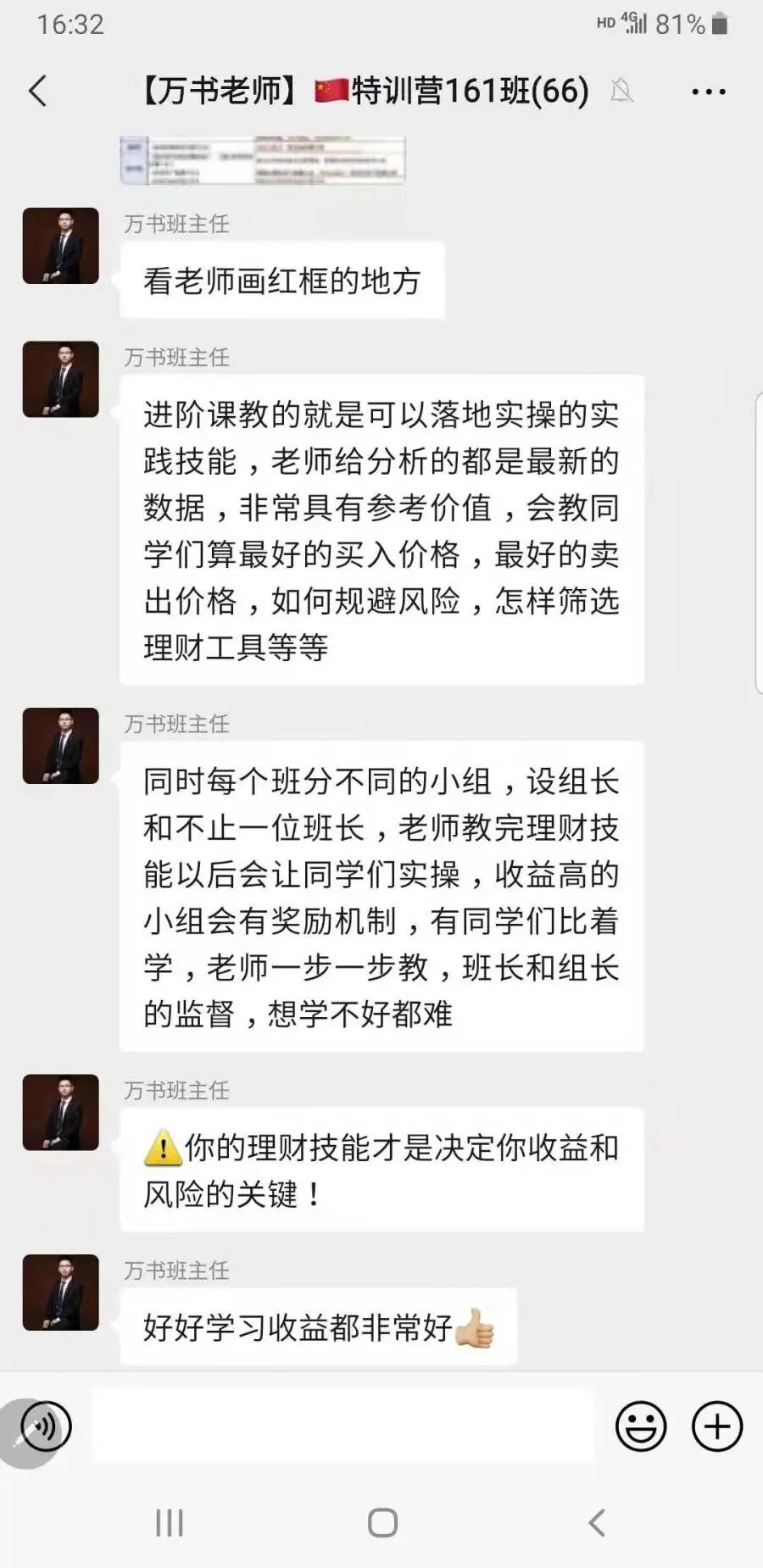近日,记者受邀花了9.9元进入到某知名财商教育机构,被拉入到一个200多人的微信群里。一位万老师每晚在微信群里进行一个多小时的语音授课,一共12天课程,课程中涉及到股票、基金、理财产品等理财内容。每次课程结束后还都留有作业。记者发现,万老师在授课中,多次提及该财商教育机构“实力雄厚”,与媒体、院校有深度合作,已经帮助很多学员实现了财富迅速增长。万老师还向学员们介绍,大家学的是基础课程,如果要在理财上有更大收获,可以选择进阶课程,并在群里发了很多截图,显示很多同学都是通过进阶课程获得了50%以上甚至好几倍的收益。而进入进阶课程,收费高达5000元以上。