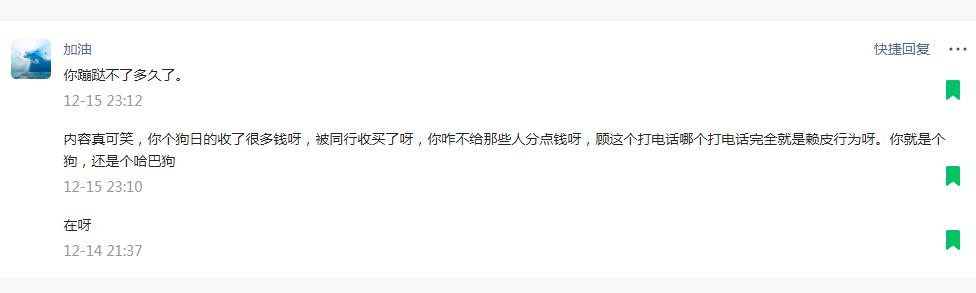 如同这样的信息或是突然添加我们骂几句恐吓几句的非常之多,我们只发布以下公众号留的这条,让社会各界和粉丝们看看!