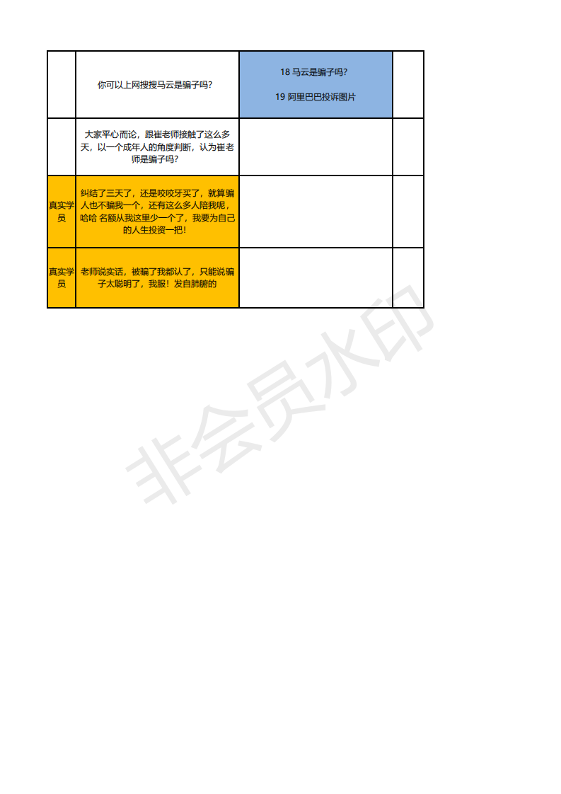 建议1、学员没有咬住不放,可以淡化软处理,注重引导官方信息。不要让学员去细看黑文。话术↓1、这个你也信啊,互联网个人媒体的利益挂钩比较多,这个自媒体是和同行业某牛商学院合作的,所以你应该懂的。咱们把关注点放在学到知识和技能上就行。我一直也给大家说看事情,做投资是一样的,我们要会去看,会去分辨消息。然后做出理性的判断,就像很多人听一个小道消息就去买入某加公司一样,其实我们不知道的是很多消息发布都是极具利益牵扯的目的性的。教大家理财的目的是教会你自己思考,而不是听信任何人,包括我说的话你也要考量,不过我所说的所有观点论点,都会有强有力的事实做论据,也希望你在看待事情和投资选择时也能做到,这样我们学习的目的就达到了。后面几天一起加油吧2、这个你可以看下漏斗百出的,首先很多内容明显就是故意制造出来的,普通人真的可以写出这么有逻辑的文章吗?有些同学会说花钱做广告,同学们你们可以反过来假设一下,你去花钱让公安局和中央财经大学给你做广告,可以吗?我们一定要有自己的判断能力,这就是老师一直在强调的认知我们在增强自己赚钱能力的同时也是会保护好自己的钱袋子,这也是我们每天午间防骗的原因3、同学,这个文章老师也看过啊,没什么意义的脏水文章,有时间看这个不如好好学习呢,同学想要了解微淼老师可以给你分享一下微淼和央财还有政府合作的信息,君子坦荡荡,小人长戚戚,我们要有独立思考的能力,老师每天都有分享防骗知识本来就影响了很多骗子的利益,所以被泼脏水是正常现象,