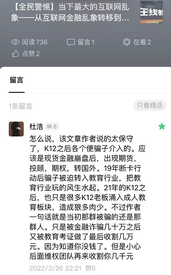 怎么说,该文章作者说的太保守了,K12之后各个便骗子介入的。应该是现货金融崩盘后,出现期货,投顾,期权,转国外。19年断卡行动后骗子被迫转入教育行业,把教育行业玩的风生水起。21年的K12之后,也只是很多K12老板涌入成人教育板块,造成狼多肉少。不过作者一句话就是当初那群被骗的还是那群人。只是被金融诈骗几十万之后又被教育考证做了最后收割几万元。因为知道你没钱了。但是小心后面维权团队再来收割你几千元!