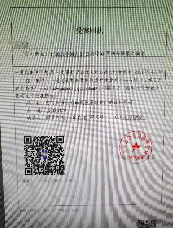 首先第一,向警方报警不一定会立案!我们了解到向警方报警,老百姓在本地基本不会立案,因为金额太小。向北京天津警方报警,我们了解的北京警方有立案,天津警方没有任何对微淼的立案情况。其中下面的受案回执后面查询后是确认被立案了!