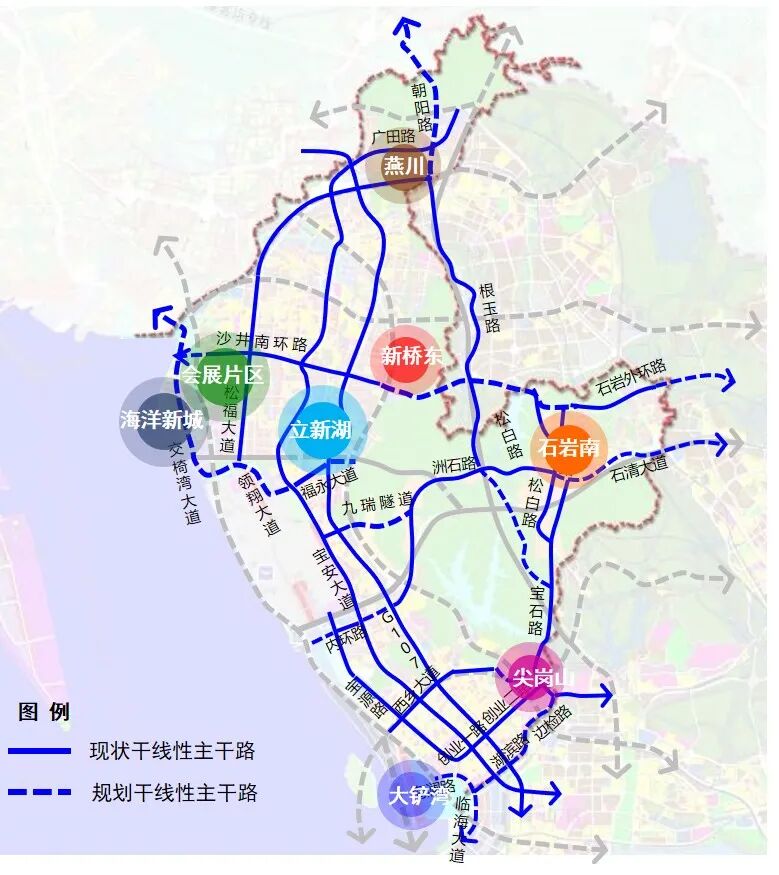 推进新安环路、裕安一路跨海大桥、海澜路跨海大桥、机场九道、沙江路、金盛路、宝石路(二期)、石观路、田心大道-如意路、沙井路、前进路等43条一般性主干道的建设(改造)工作,完善城区内部骨干路网布局。