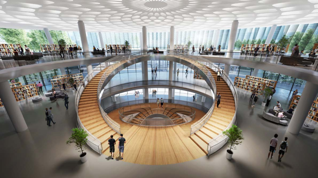 地下建筑面积9.6万平方米,主要包括公共阅读、亲子活动体验、剧场、文化发布厅及服务配套等。