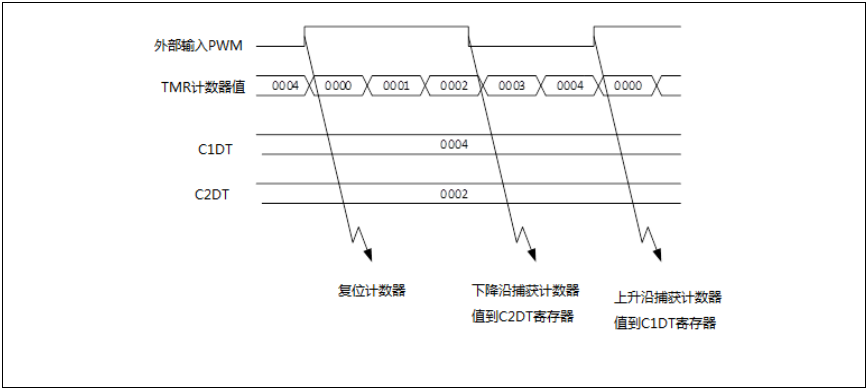 另外,还提供了更加高效的PWM波输入捕获功能,可以更方便的计算出输入波形的频率和占空比。此模式的通过内部两个CxDT寄存器实现,输入波形通过定时器的通道1或者通道2输入即可。将定时器配置成PWM输入模式后,可通过C1DT和C2DT的值计算出对应PWM波形的频率和占空比: