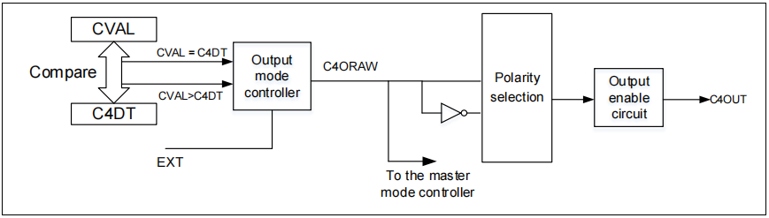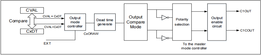 图中当受到外部触发后,TMR开始计数,当CVAL等于CxDT时,改变输出状态,当CVAL溢出时,输出状态再次改变从而达到输出一个单脉冲的目的。