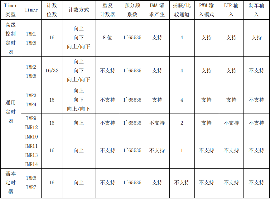 定时器种类有基本定时器、通用定时器、高级控制定时器,以AT32F435xx举例,下表为各种类型定时器的功能总表。本文主要就定时器溢出中断进行基础讲解和案列解析。定时器溢出中断是定时器最基础功能,进入中断的时间周期可由相关寄存器配置。