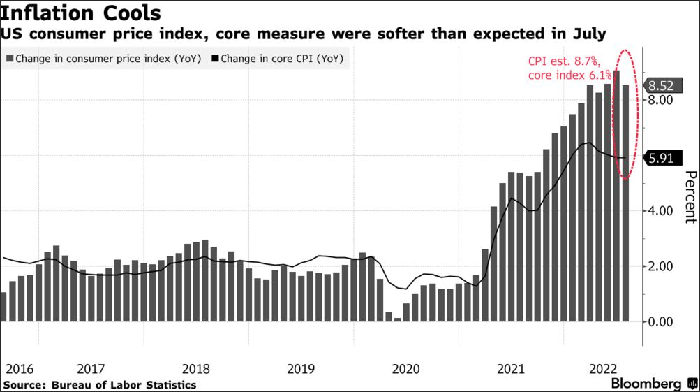 美国通胀数据图表,7月CPI同比增长8.5%,核心CPI同比增长5.9%,低于预期(红字数据)。