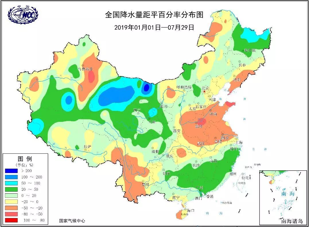 1月1日至7月29日全国降水量距平百分率分布(单位:%)