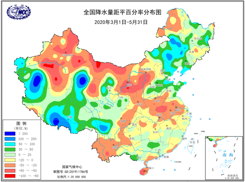 全国降水量略偏少,为2012年以来最少,空间差异大。2020年春季,全国平均降水量137.0毫米,较常年同期(143.7毫米)偏少4.7%,为2012年以来最少(图4)。内蒙古东部、黑龙江东部、辽宁大部、河北东北部、山东西北部、青海西部、西藏大部、新疆西南部等地降水量较常年同期偏多2成至2倍,局地偏多2倍以上;江汉、江淮西部、云南、四川东部、宁夏、陕西、内蒙古西部、新疆大部等地降水量较常年同期偏少2~8成,局地偏少8成以上。![]()