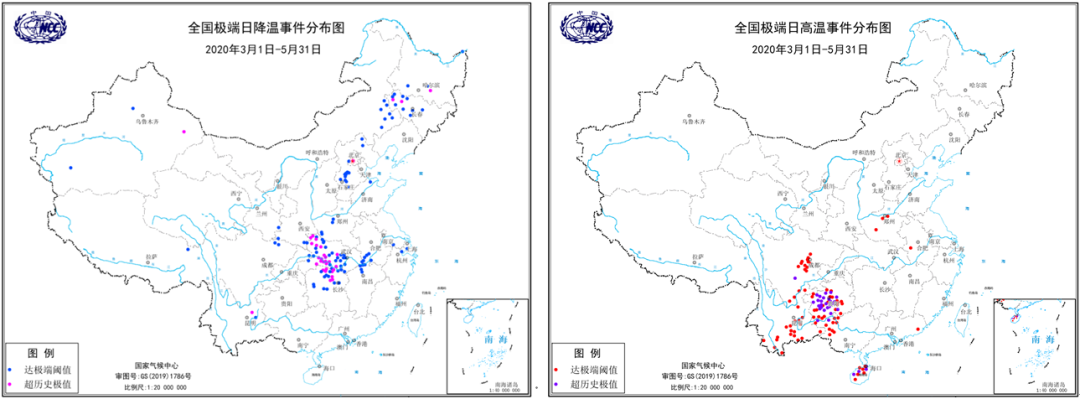 季内气温起伏大,贵州、云南、四川、广西、海南、河南等地共109站发生极端高温事件,其中贵州罗甸(41.2℃,5月8日)、海南儋州(41.1℃,5月7日)等31站日最高气温突破历史极值(图3);同时,东北、华北、湖北、湖南、新疆等地共131站日降温达到极端事件标准,其中吉林洮南(15.0℃,4月20日)、湖北房县(14.7℃,3月27日)等32站日降温突破历史极值。 ![]()