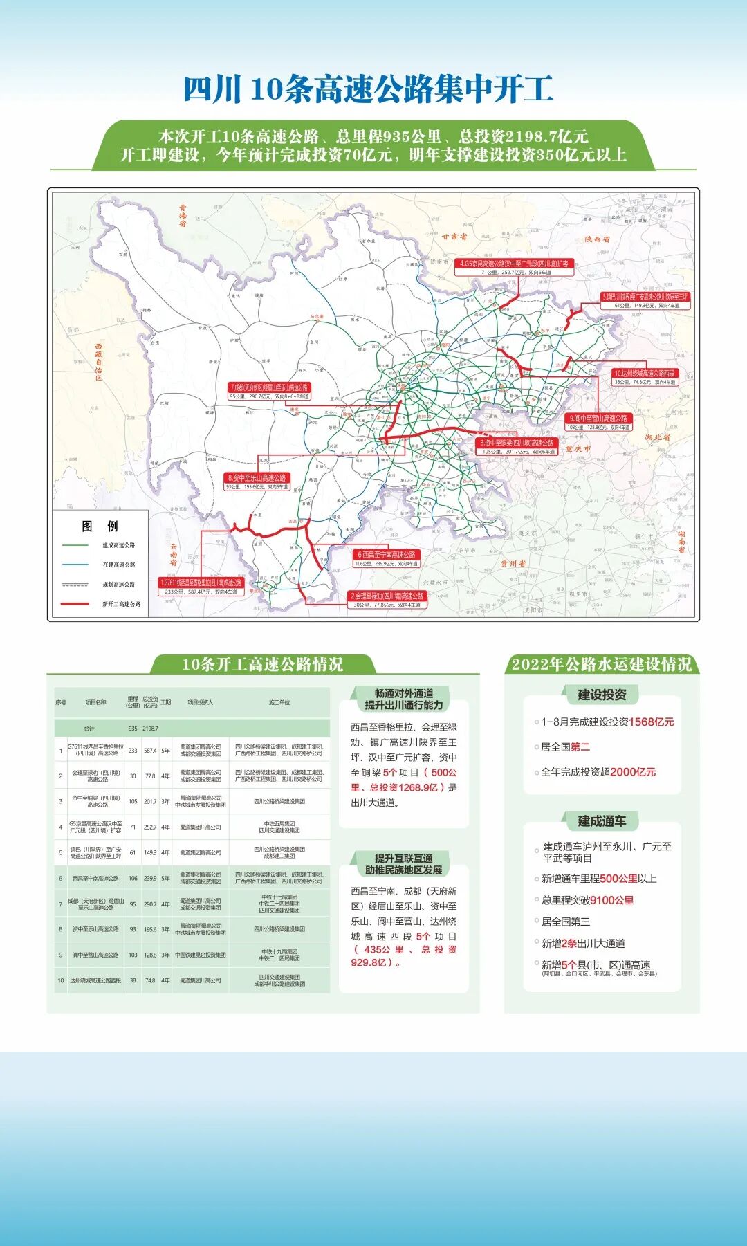 西昌至宁南、成都(天府新区)经眉山至乐山、资中至乐山、阆中至营山、达州绕城高速西段5个项目(435公里、总投资930亿)将在提升路网互联互通水平,助推乡村振兴、民族地区、革命老区发展等方面发挥重要作用。