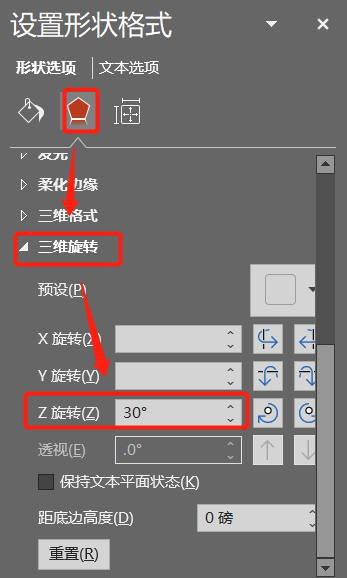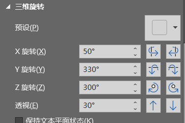 我们可以把X旋转50°,Y旋转330°,Z旋转300°,透视选择30°,参考数据如下: