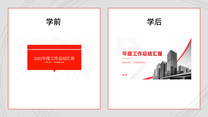 在本次突击营里,我们会将年终总结PPT拆分为2个大板块,第1个板块是门面和逻辑。实际上,PPT最需要做设计的页面其实是封面页。