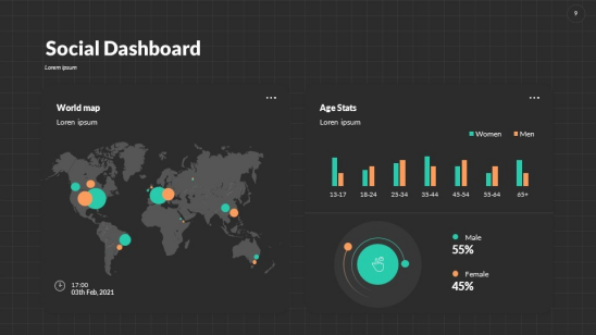 这张案例添加了图标、圆形、圆角矩形和不规则形状,并且在圆形上还做了虚实结合的处理,看上去层次感就会比上一张案例强很多。