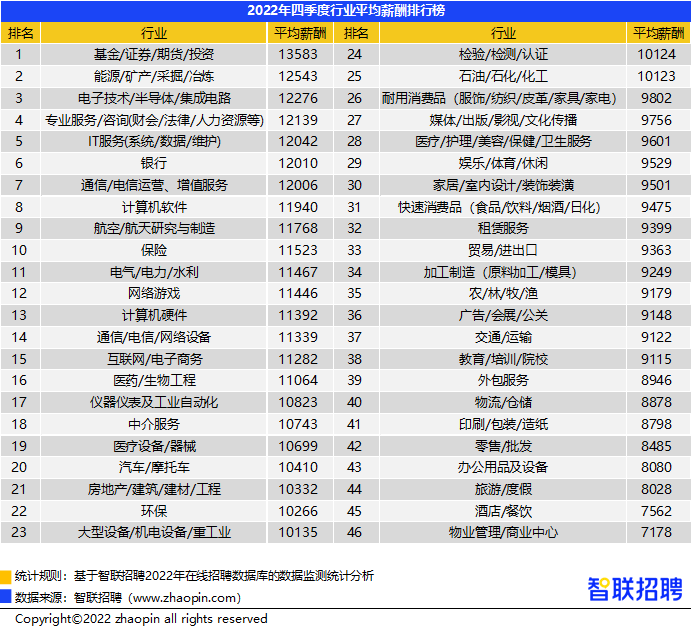 四季度:金融、IT互联网行业薪资高,旅游、酒店餐饮业处于低位