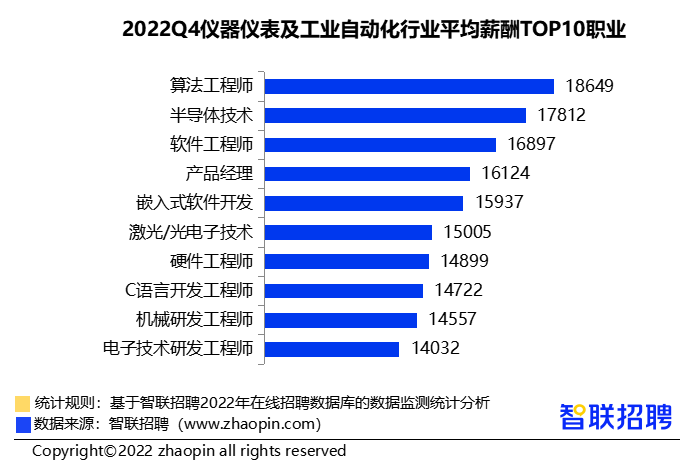 进一步以仪器仪表及工业自动化行业为例,分析高技术制造行业的高薪岗位,发现工程师、研发岗薪资优势突出。高技术制造业强调关键技术创新和突破,对于高技能人才需求增长旺盛,必然带动技术岗位薪资水平走高。结合具体岗位来看,仪器仪表及工业自动化行业中算法工程师(18649元)、半导体技术(17812元)、软件工程师(16897元)、硬件工程师(14899元)等人才的薪资水平领先, C语言开发、机械研发、电子技术研发等工程师和研发人员薪酬也明显较高。高技术制造业企业的竞争归根到底是对于高端技术人才的抢夺,高薪引才是企业制胜的关键。