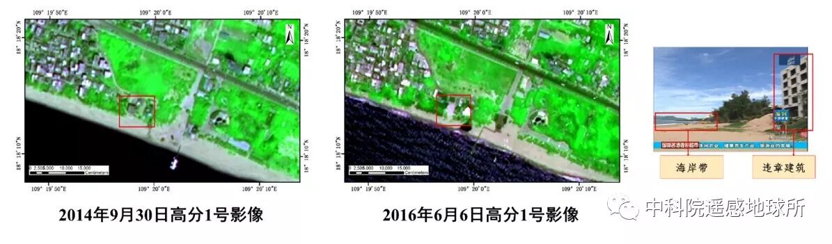 利用高分辨率遥感卫星影像有助于对较小目标的精准识别,从而服务于违章建筑的排查与监管。上图为三亚市海坡村的凤凰豪生酒店于2015年4月底被拆除,该建筑未取得许可证和报建手续,并且存在安全隐患,媒体对该违章建筑的拆除进行了新闻报道。