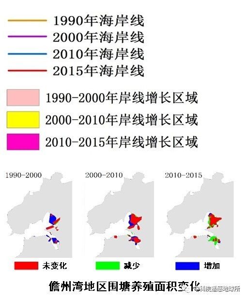 儋州湾地区的海岸线在1990-2010年期间发生了显著变化。1990年以后,该地养殖业发展迅速,围塘养殖面积明显增加,人工岸线增长显著;2000-2010年,为加快经济发展,该地沿北部湾一带进行人工填海和洋浦港建设,填海造陆和港口扩张使得该地海岸线继续向海推进;相较于前20年,该地2010-2015年期间的岸线变化不明显。