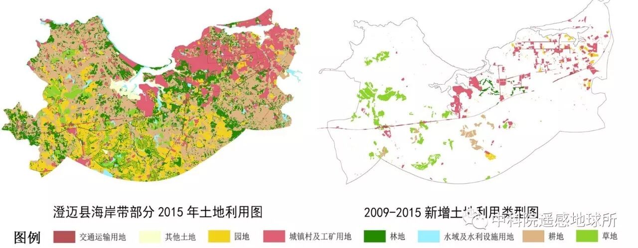 澄迈县海岸带部分2015年较2009年新增的城镇村及工矿用地面积所占的比例为全省最大,占澄迈县海岸带部分新增土地面积的39.1%。这是由于澄迈县2009年到2015年经济水平提高,城镇化速度加快所致。