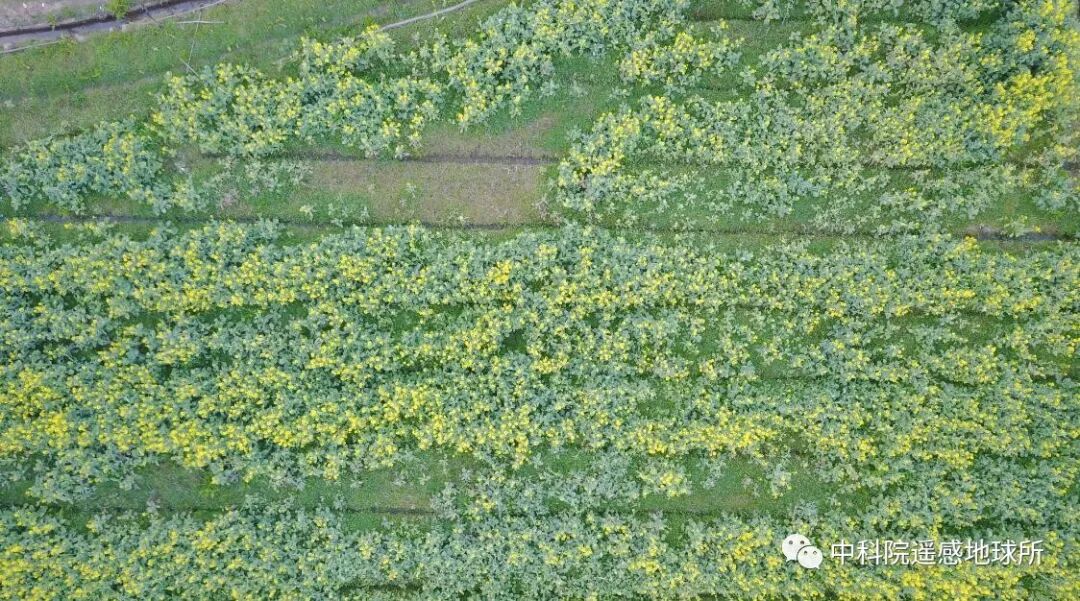 无人机悬停在高度20m处的航拍图,能清晰分辨油菜花、叶和土壤。