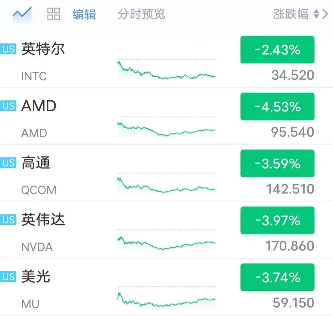 就在该法案签署当日,美股三大指数集体收跌,其中半导体板块领跌,费城半导体指数最深跌超170点或跌5.7%,接连跌破3000和2900点两道整数位,收跌4.6%,连跌三日至7月26日来新低。特别是英伟达、美光科技等芯片巨头股票跌超3%。