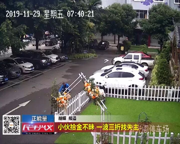 当天上午,前往参加单位组织的工作学习的谢辉在途经黔山酒店门口停车场的时候,看见地上有一些现金,走近仔细一看,是一沓百元钞票,当时是早上八点左右,进出的人不多,谢辉在原地等了一会儿,没有人回来寻找丢失的现金,谢辉决定将现金拾起来,但是他并没有将钱揣进自己的口袋,而是拿到黔山酒店前台处,询问是否可以帮助存放等失主回来认领,但是前台工作人员也表示现金没有标记,自己无法做主,担心这笔钱会被别人冒领,于是谢辉便麻烦酒店工作人员调出当天的监控,看看是否能找到这笔钱的失主,监控中显示当天有一辆车停到停车场,司机从车上下车后,在行走的过程中从口袋里摸东西,期间有一沓钱掉落在地上,他本人并未察觉,随后谢辉路过发现将钱拾起。于是,谢辉一直在酒店大等待,大概二十分钟以后,由于还有工作要忙,谢辉决定先把钱带走,他到黔山酒店及隔壁的皇冠酒店前台都登记了自己的电话号码,并希望如果有人回来寻找一定要第一时间联系他,避免失主着急。